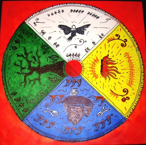 Am anderen Tag dann die Reise zum Orakelbrett, ich sah die Farben und Symbole plastisch vor meinem Auge und habe es dann auch so auf die Leinwand gebracht. Ach so, der Baum, der vom Wind leicht gebeugt wird, wollte ich nicht malen, aber das Bild war irgendwie unfertig, also malte ich dann doch den Baum und genau das wars, das Bild war fertig, die Energie floß.